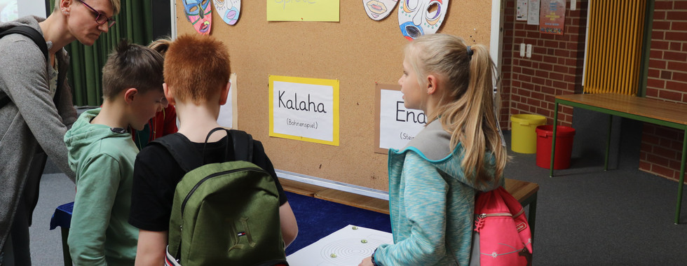 In den Räumlichkeiten der Schule erfuhren die Schüler:innen nicht nur viel Wissenswertes über die Menschen und das Leben in Afrika, die Traditionen sowie die Pflanzen- und Tierwelt, sie erlebten Afrika mit dem ganzen Körper. In täglich wechselnden Angeboten konnten die Schüler:inen in Kleingruppen typisch afrikanische Spiele auf dem Schulhof und der Turnhalle spielen, sich im Brettspiel Kalaha ausprobieren, Schmuckstücke herstellen, afrikanische Savannenbilder kreieren, tanzen, essen und vieles mehr…. Ein besonderes Highlight in dieser Projektwoche war zudem der Besuch von Stephanie Mülder (Stephies Oktave in Stade). Sie gewann die Kinder schnell für sich und verwandelte unser Forum in eine afrikanische Trommeloase.