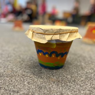 Vorab bastelt sich jedes Kind eine kleine Handtrommel aus einem Tontopf. Diese wurden dankenswerterweise vom Schulförderverein der Schule gesponsert. Geschickt delegierte Stephanie Mülder täglich fünf Gruppen in Stärke von ca. 50 Kindern und brachte ihnen so rhythmische Trommelstücke und afrikanische Lieder bei.