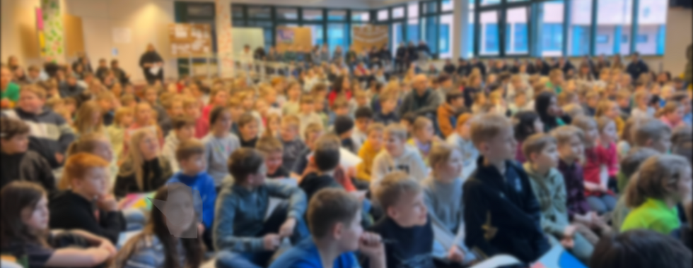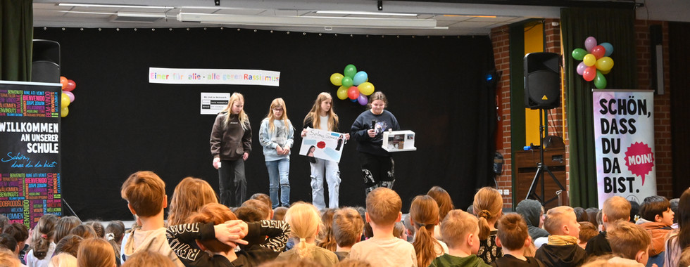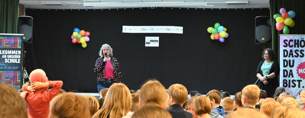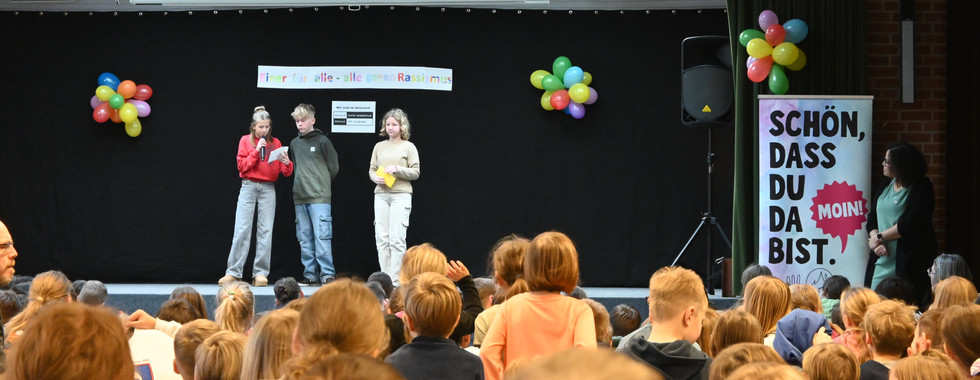 Eine besondere Darbietung war der Beitrag des 4. Jahrgangs. Die Schüler:innen hatten im Vorfeld eine Umfrage in allen Klassen durchgeführt und in einer anschließenden Präsentation, mit musikalischer Untermalung, einen Weg gefunden, die Vielfalt unserer Schule deutlich zu machen. Wir haben verschiedene Haarfarben, unterschiedliche Lieblingsspeisen, Hobbys, Träume, Ängste und verschiedene Herkunftsländer – doch all dies ist nötig, damit wir voneinander lernen können. So ist es nie langweilig, wir haben die Chance, neue Erfahrungen zu machen, und vor allem bestätigt es unser Leitmotiv: 'WIR SIND BUNT'.“